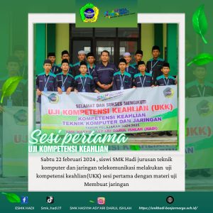 Siswa/i kelas akhir SMK Hasyim Asy’ari Darul Ishlah jurusan Teknik Komunikasi dan Jaringan (TKJ) & Akuntansi Lembaga Keuangan (AKL) melaksanakan kegiatan Uji Kompetensi Keahlian (UKK) sebagai bentuk evaluasi yang dilakukan untuk mengukur sejauh mana kompetensi atau keterampilan siswa dalam bidang keahlian yang mereka pelajari selama di SMK dan sebagai syarat utama bagi siswa SMK HADI untuk memperoleh sertifikat terbatas selain ijazah.